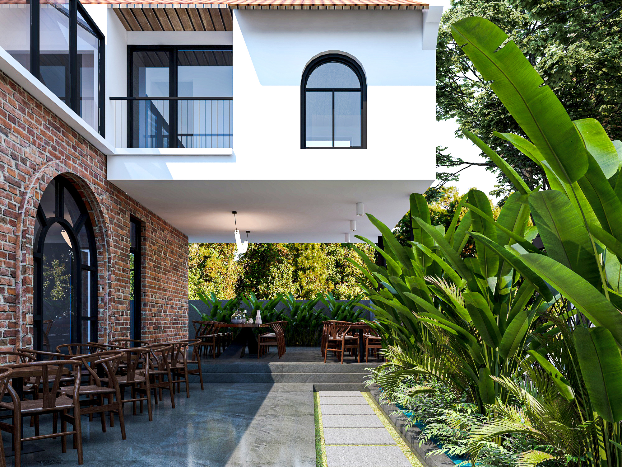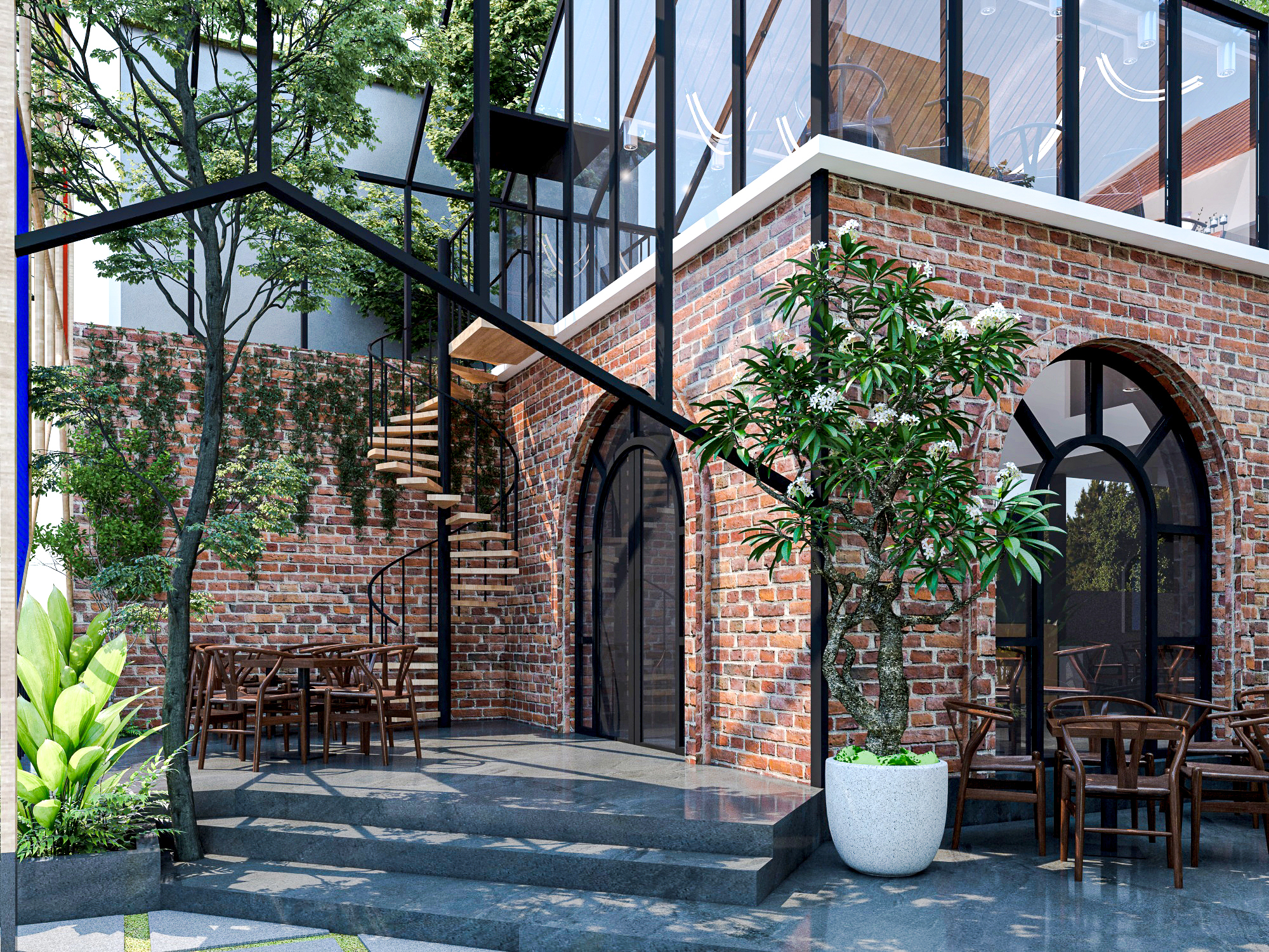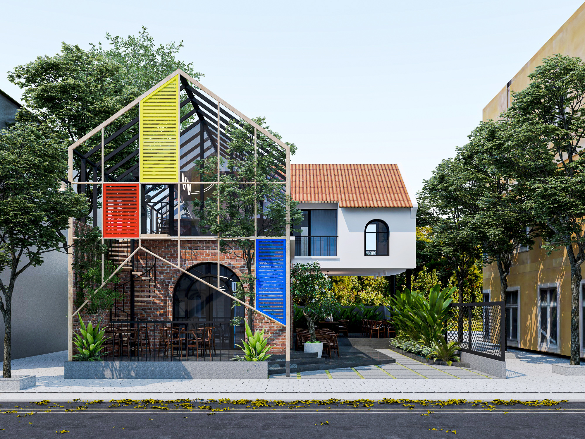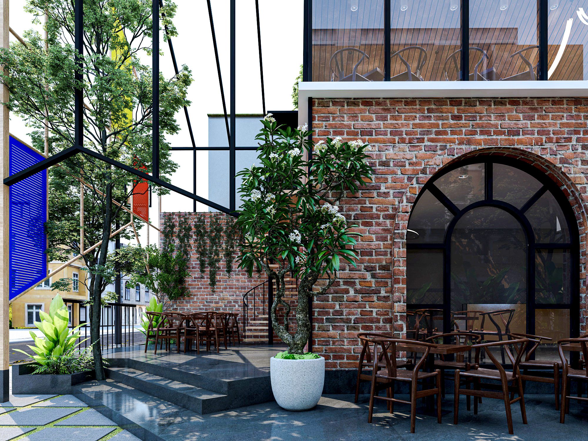 Ở dự án QB house & coffee chủ đầu tư đưa ra đầu bài thiết kế quán coffee hai tầng phục vụ cho nhu cầu kinh doanh nhưng đi kèm một không gian dạng căn hộ studio với một phòng ngủ và có đầy đủ các chức năng cần thiết như bếp ăn vệ sinh riêng và phòng thờ. Team thiết kế làm việc, nghiên cứu đưa ra phương án lấy hai màu sắc vật liệu chính là gạch trần không trát và các mảng khối trắng làm sự tương phản để tạo nên điểm nhấn cho công trình cũng như phân định không gian kinh doanh coffee và không gian dạng căn hộ cho gia chủ. Phần căn hộ nằm ở tầng hai với khối bay ra, đầy đủ các chức năng cùng một tầng khép kín. Phần kinh doanh coffee nằm ở tầng một, sân vườn và một phần ở tầng hai.