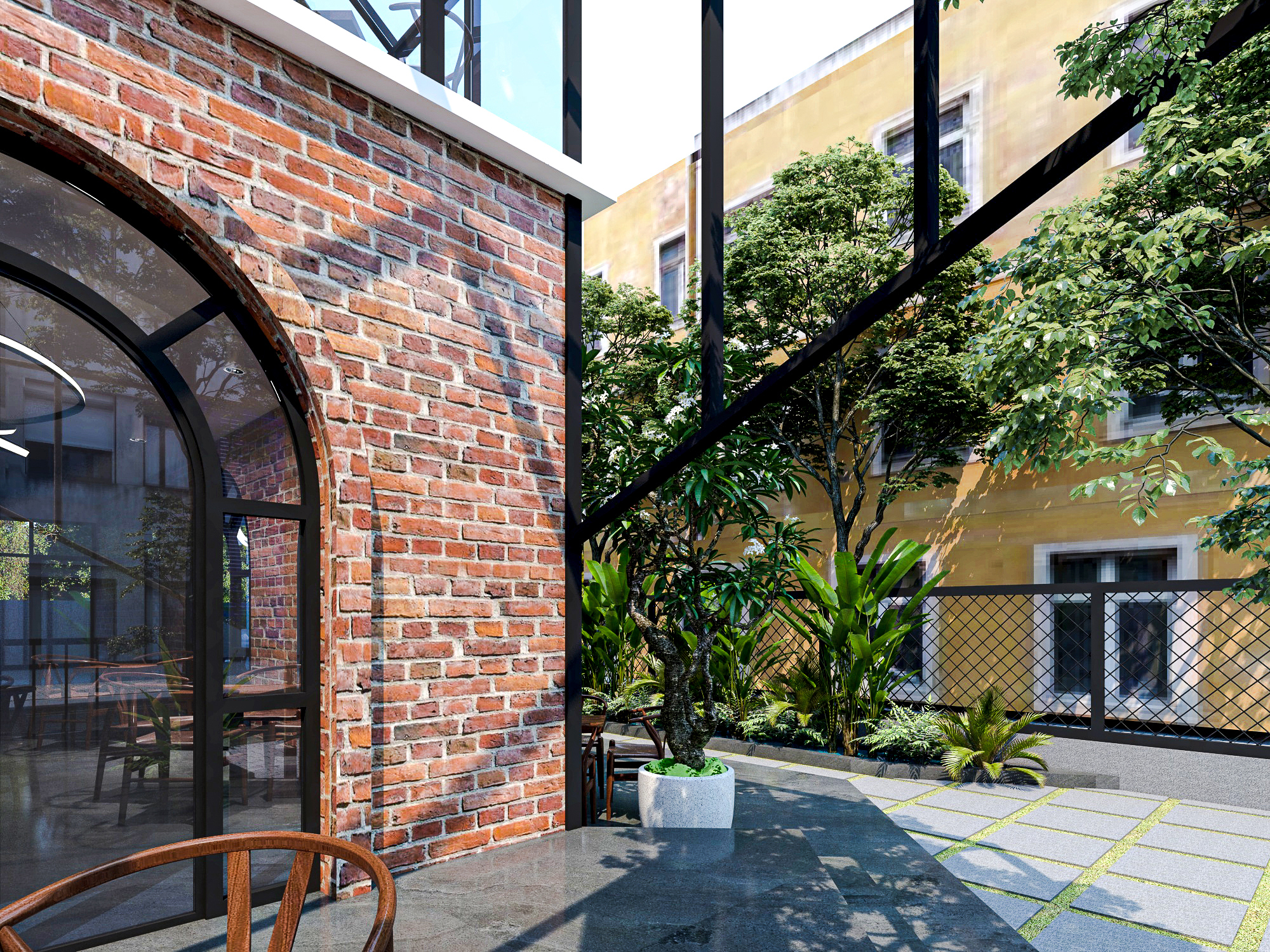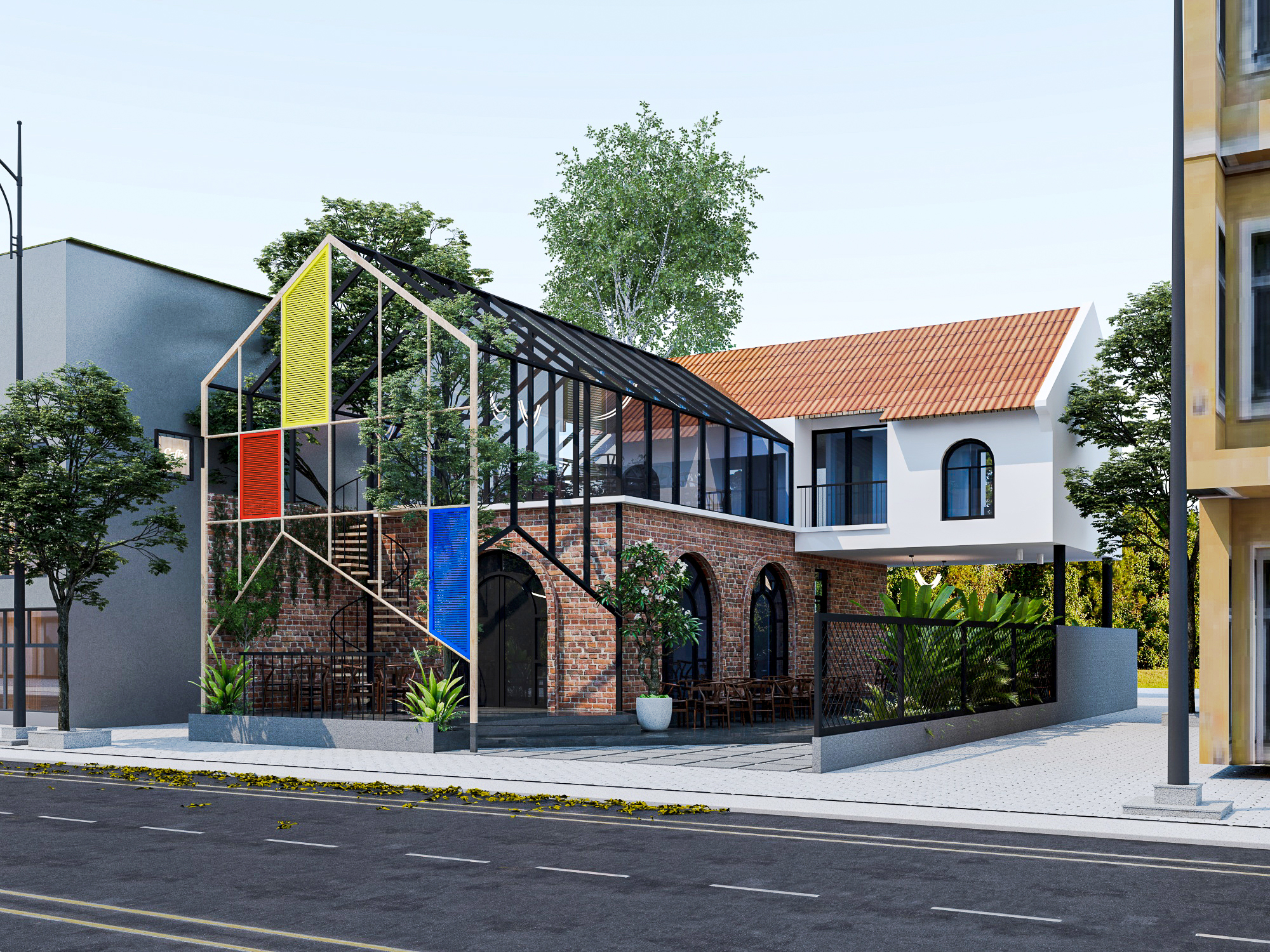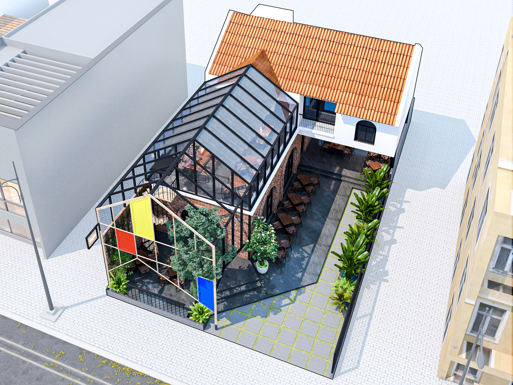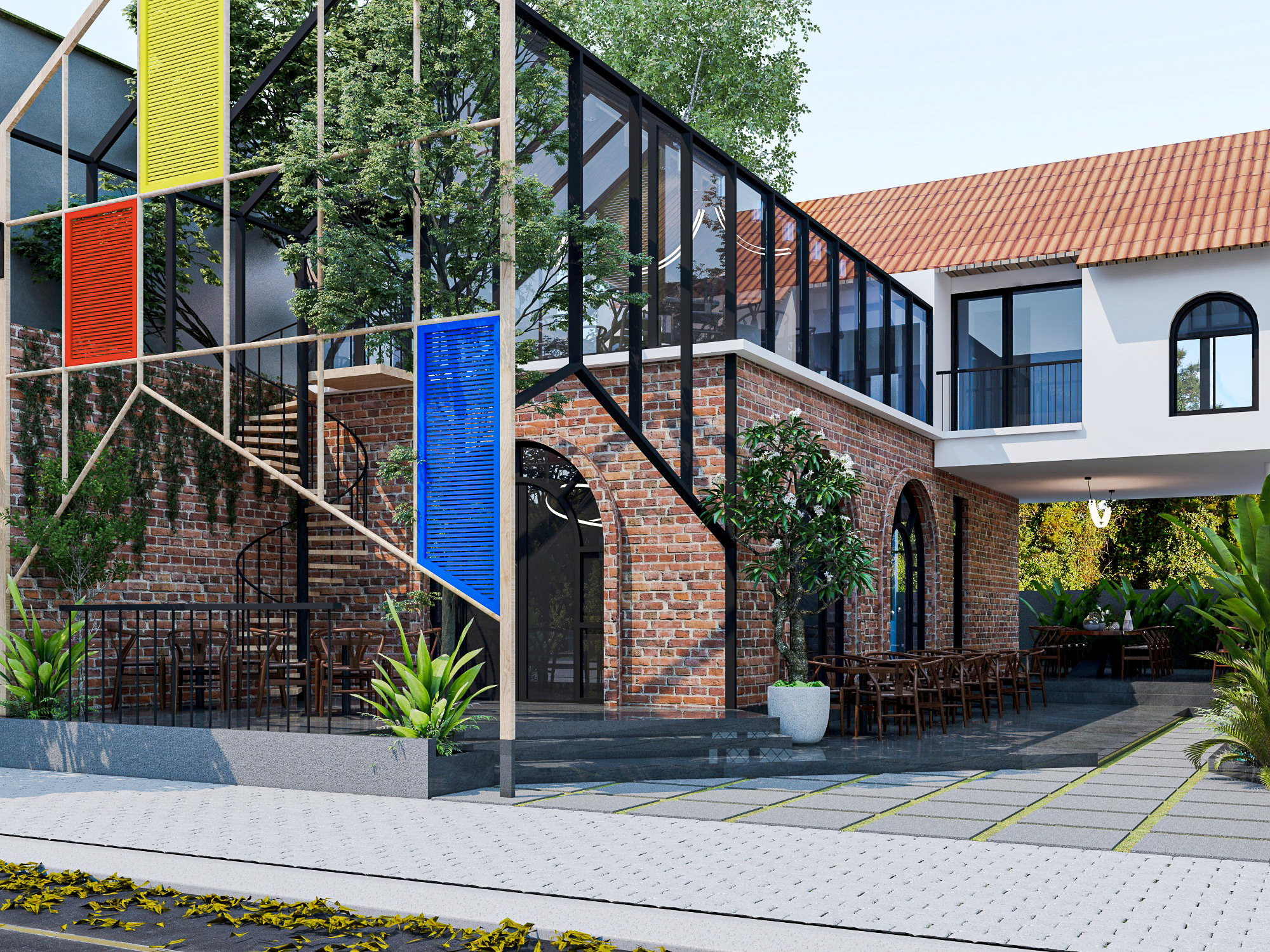 Ở dự án QB house & coffee chủ đầu tư đưa ra đầu bài thiết kế quán coffee hai tầng phục vụ cho nhu cầu kinh doanh nhưng đi kèm một không gian dạng căn hộ studio với một phòng ngủ và có đầy đủ các chức năng cần thiết như bếp ăn vệ sinh riêng và phòng thờ. Team thiết kế làm việc, nghiên cứu đưa ra phương án lấy hai màu sắc vật liệu chính là gạch trần không trát và các mảng khối trắng làm sự tương phản để tạo nên điểm nhấn cho công trình cũng như phân định không gian kinh doanh coffee và không gian dạng căn hộ cho gia chủ. Phần căn hộ nằm ở tầng hai với khối bay ra, đầy đủ các chức năng cùng một tầng khép kín. Phần kinh doanh coffee nằm ở tầng một, sân vườn và một phần ở tầng hai.