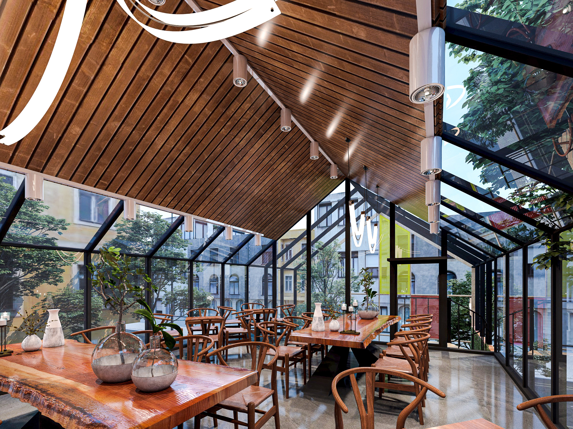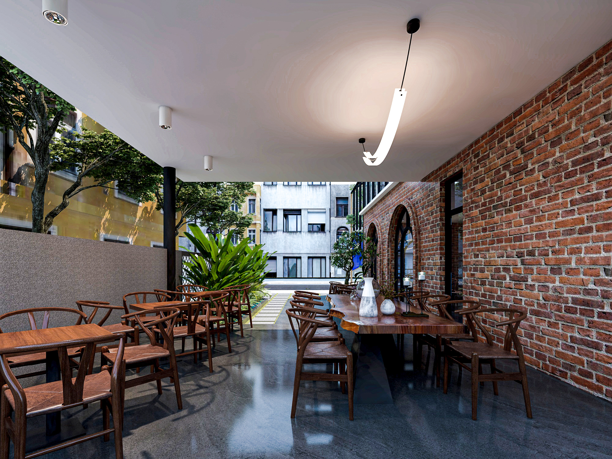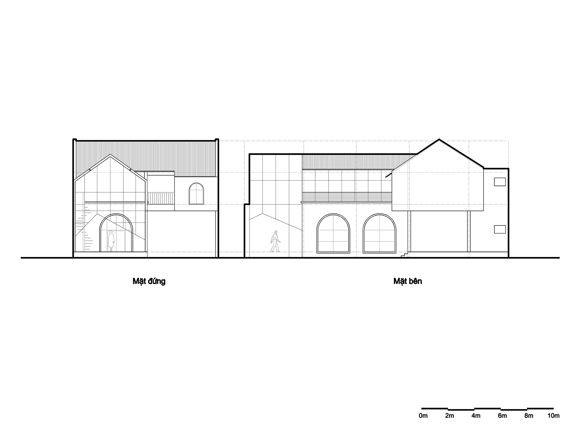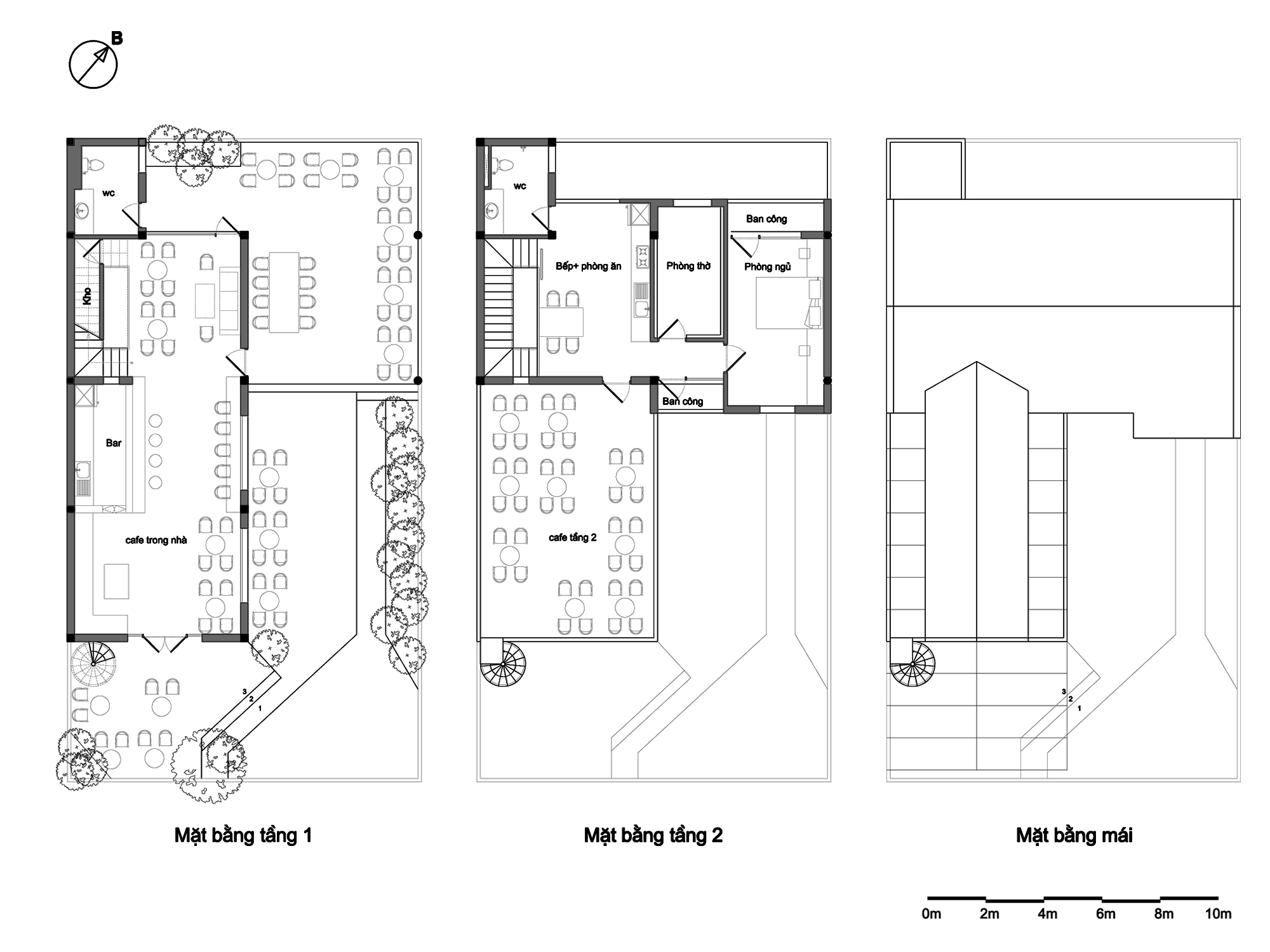 Ở dự án QB house & coffee chủ đầu tư đưa ra đầu bài thiết kế quán coffee hai tầng phục vụ cho nhu cầu kinh doanh nhưng đi kèm một không gian dạng căn hộ studio với một phòng ngủ và có đầy đủ các chức năng cần thiết như bếp ăn vệ sinh riêng và phòng thờ. Team thiết kế làm việc, nghiên cứu đưa ra phương án lấy hai màu sắc vật liệu chính là gạch trần không trát và các mảng khối trắng làm sự tương phản để tạo nên điểm nhấn cho công trình cũng như phân định không gian kinh doanh coffee và không gian dạng căn hộ cho gia chủ. Phần căn hộ nằm ở tầng hai với khối bay ra, đầy đủ các chức năng cùng một tầng khép kín. Phần kinh doanh coffee nằm ở tầng một, sân vườn và một phần ở tầng hai.