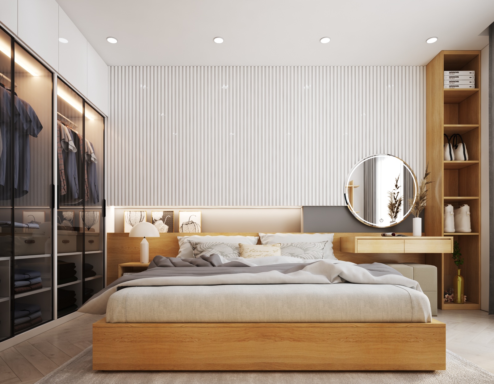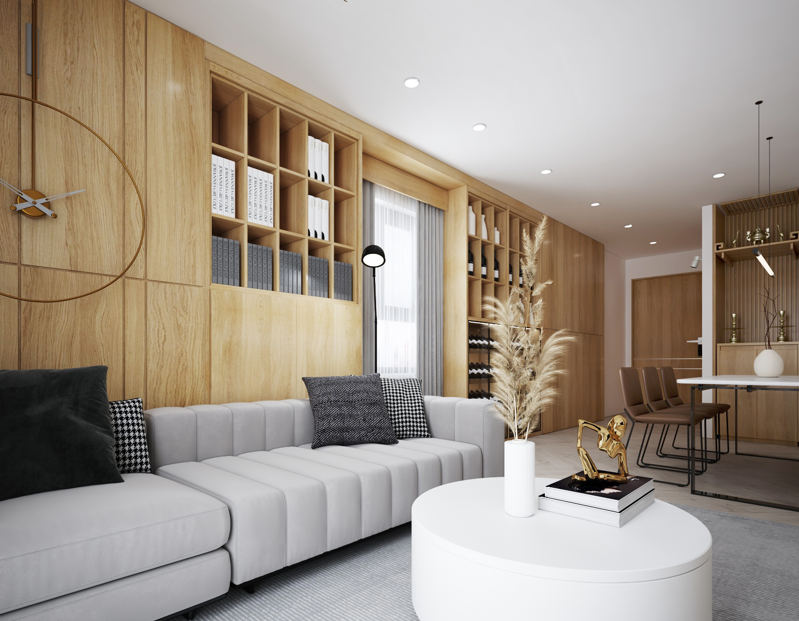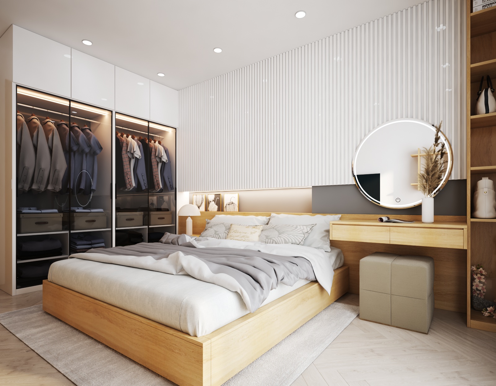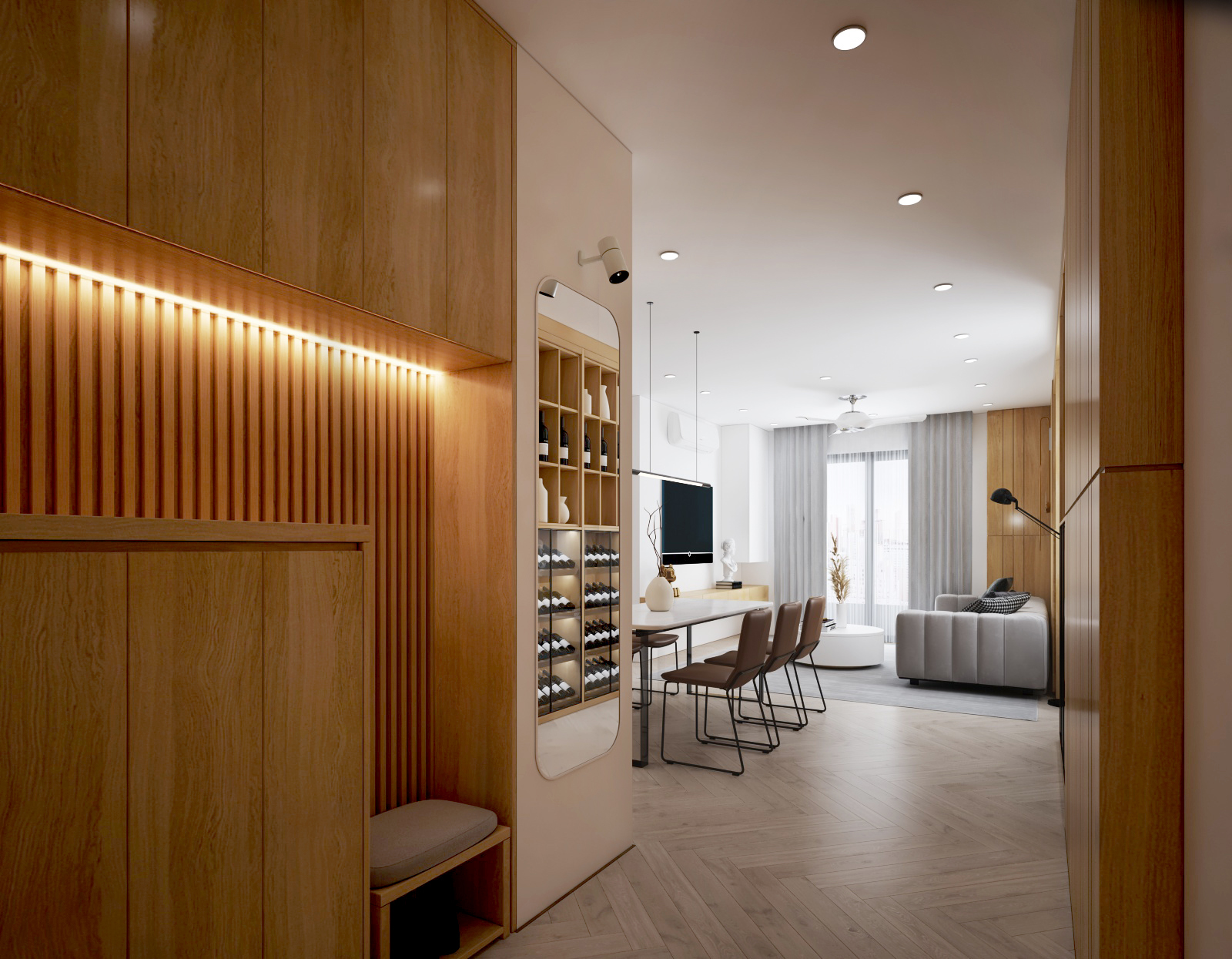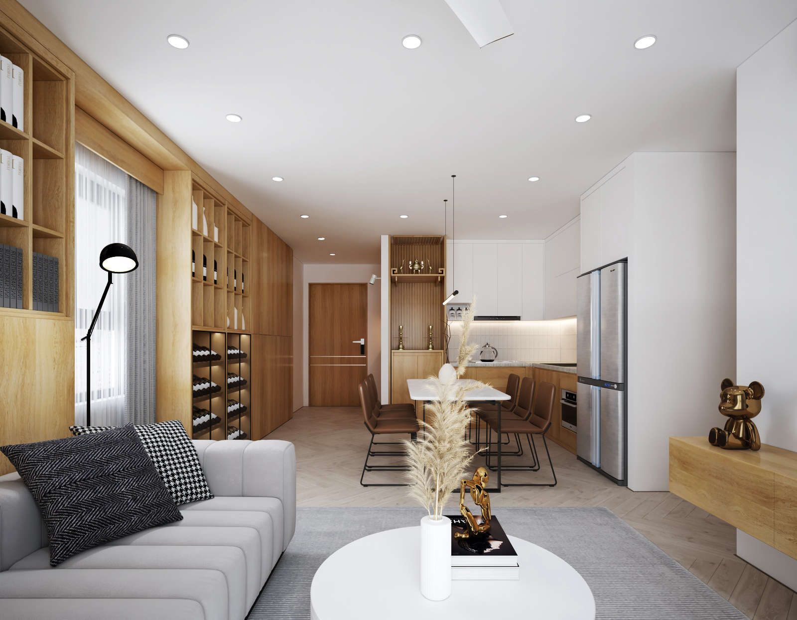 Nội thất căn hộ ba phòng ngủ chủ đầu tư hướng đến màu sắc sáng đi kèm kết hợp giữa màu sắc vân gỗ sáng và màu trắng để không gian được trong sáng nhất có thể. Thiết kế nhấn mạnh theo các mảng miếng để tương quan màu sắc tổng thế được mạnh hơn tạo điểm nhấn không gian.