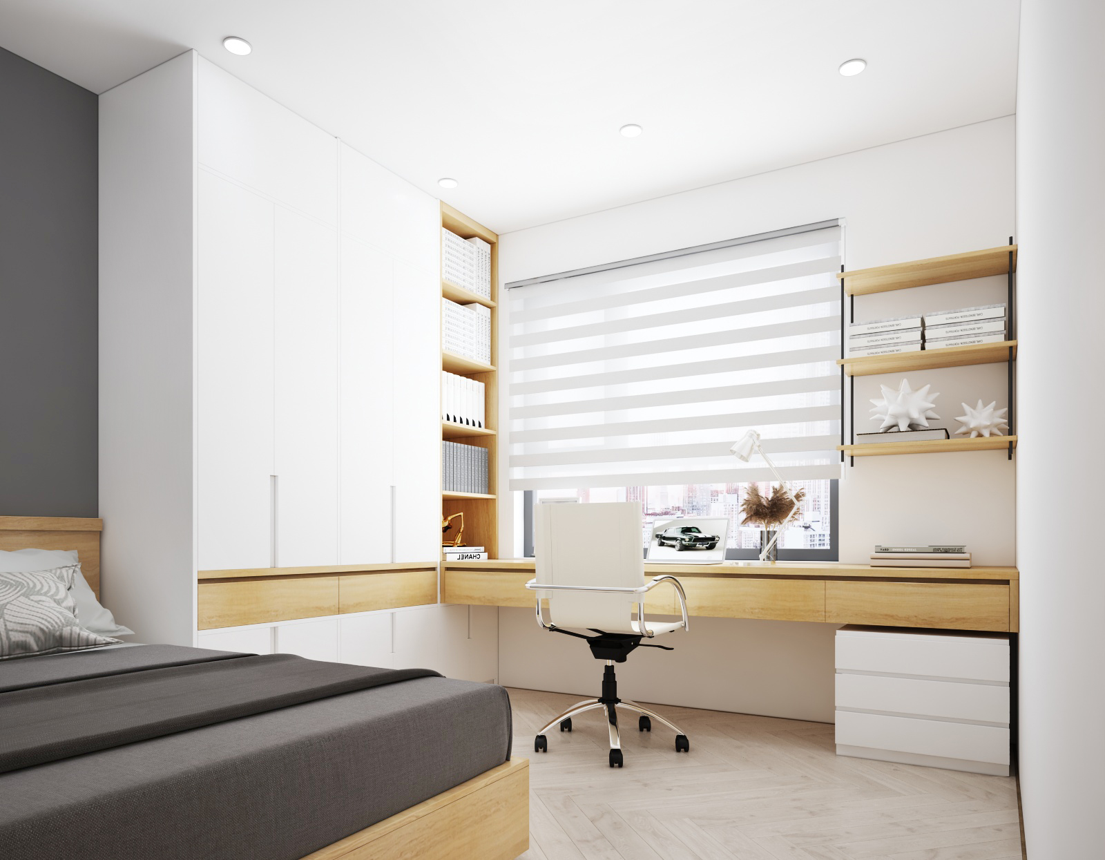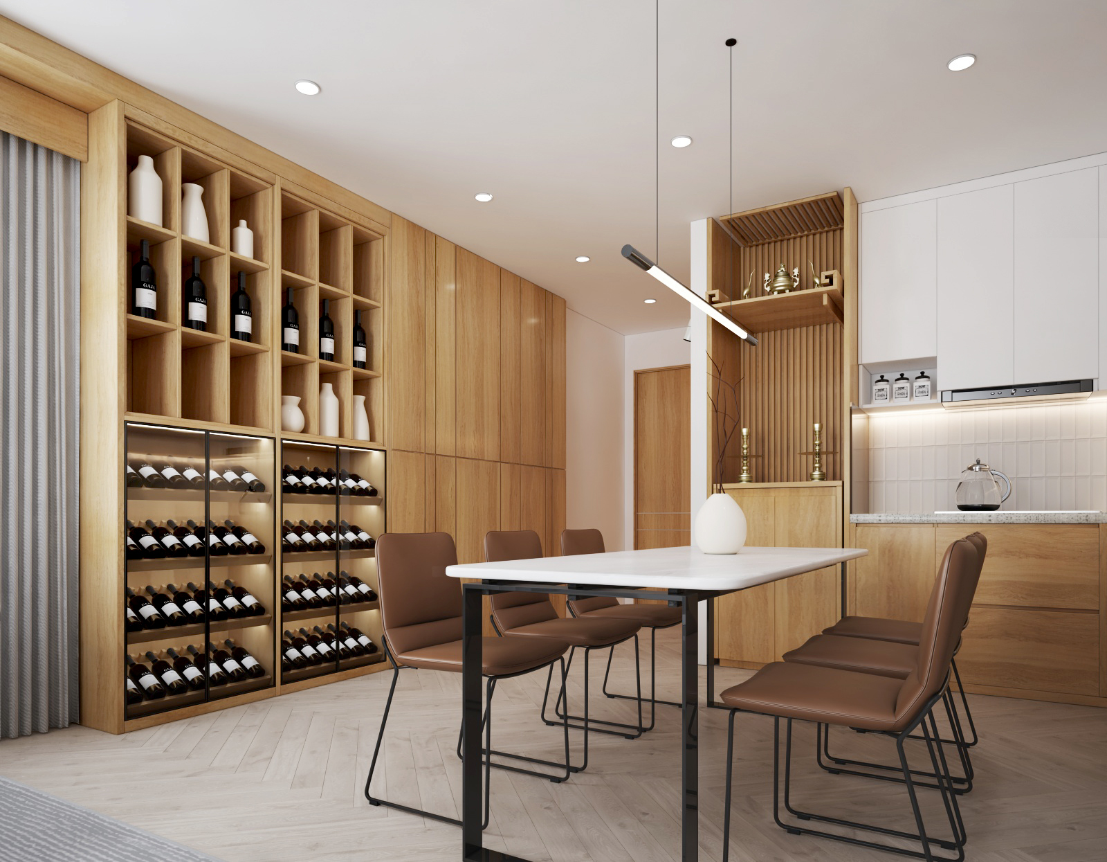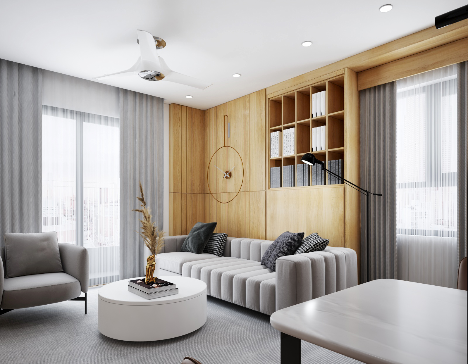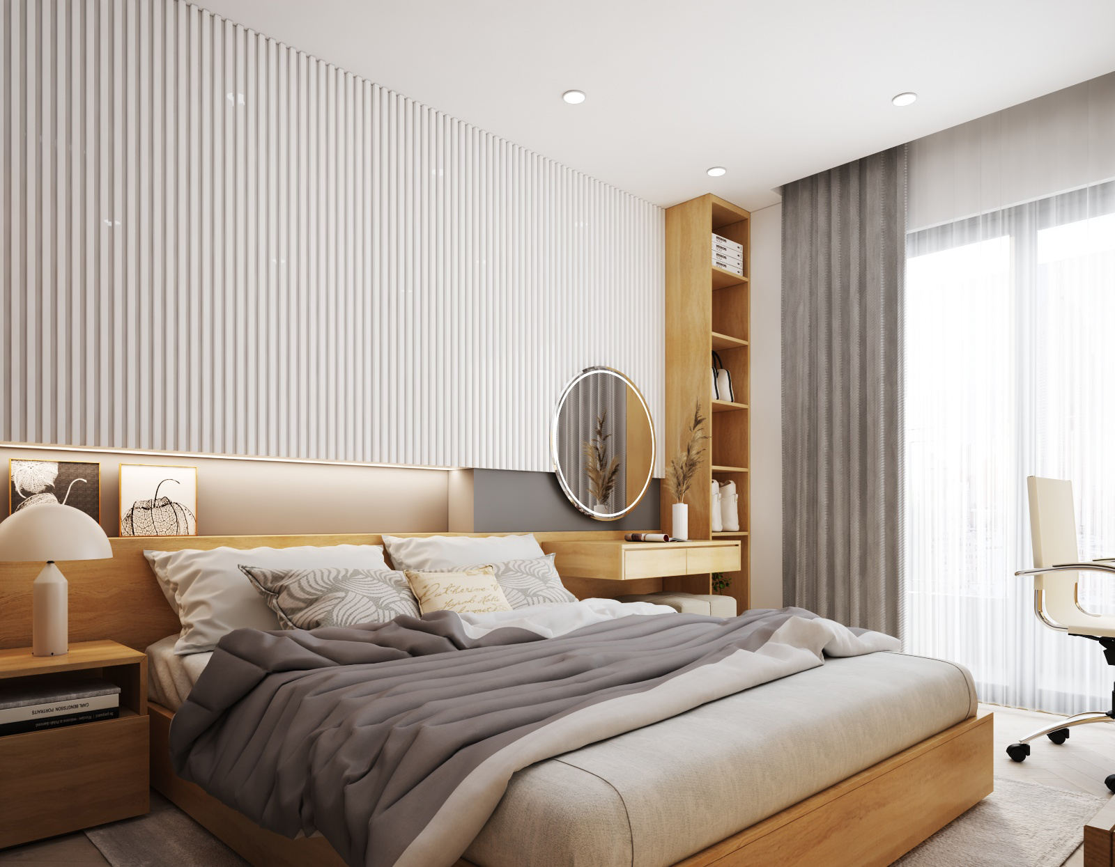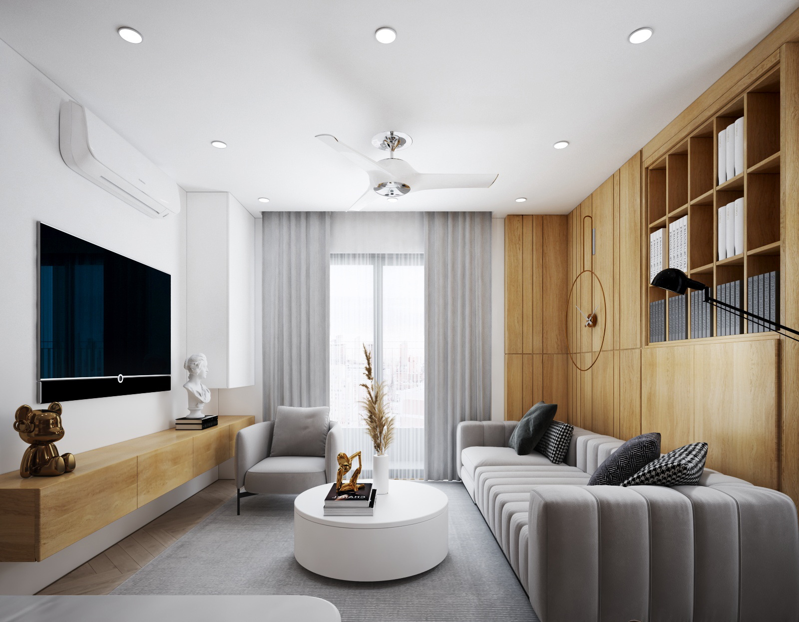 Nội thất căn hộ ba phòng ngủ chủ đầu tư hướng đến màu sắc sáng đi kèm kết hợp giữa màu sắc vân gỗ sáng và màu trắng để không gian được trong sáng nhất có thể. Thiết kế nhấn mạnh theo các mảng miếng để tương quan màu sắc tổng thế được mạnh hơn tạo điểm nhấn không gian.