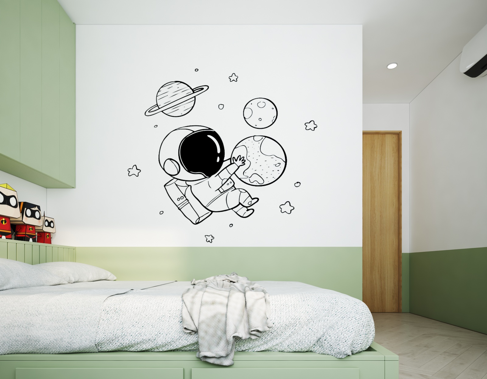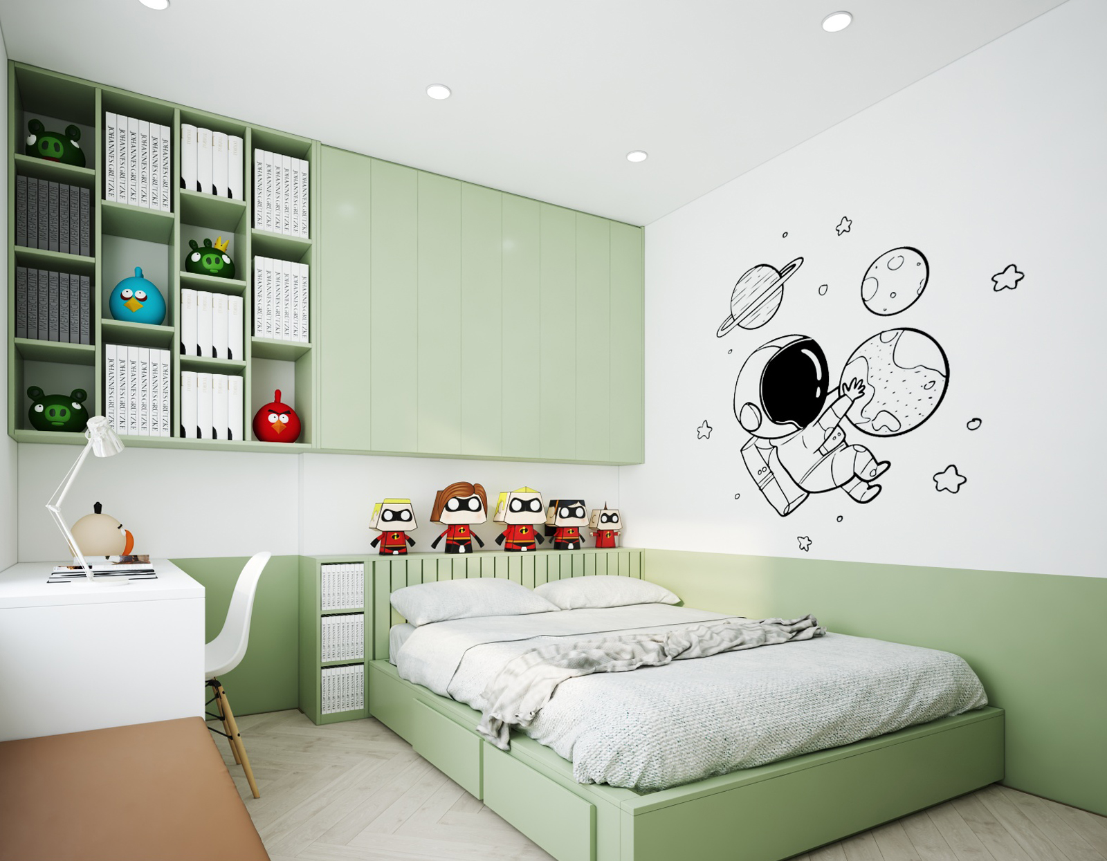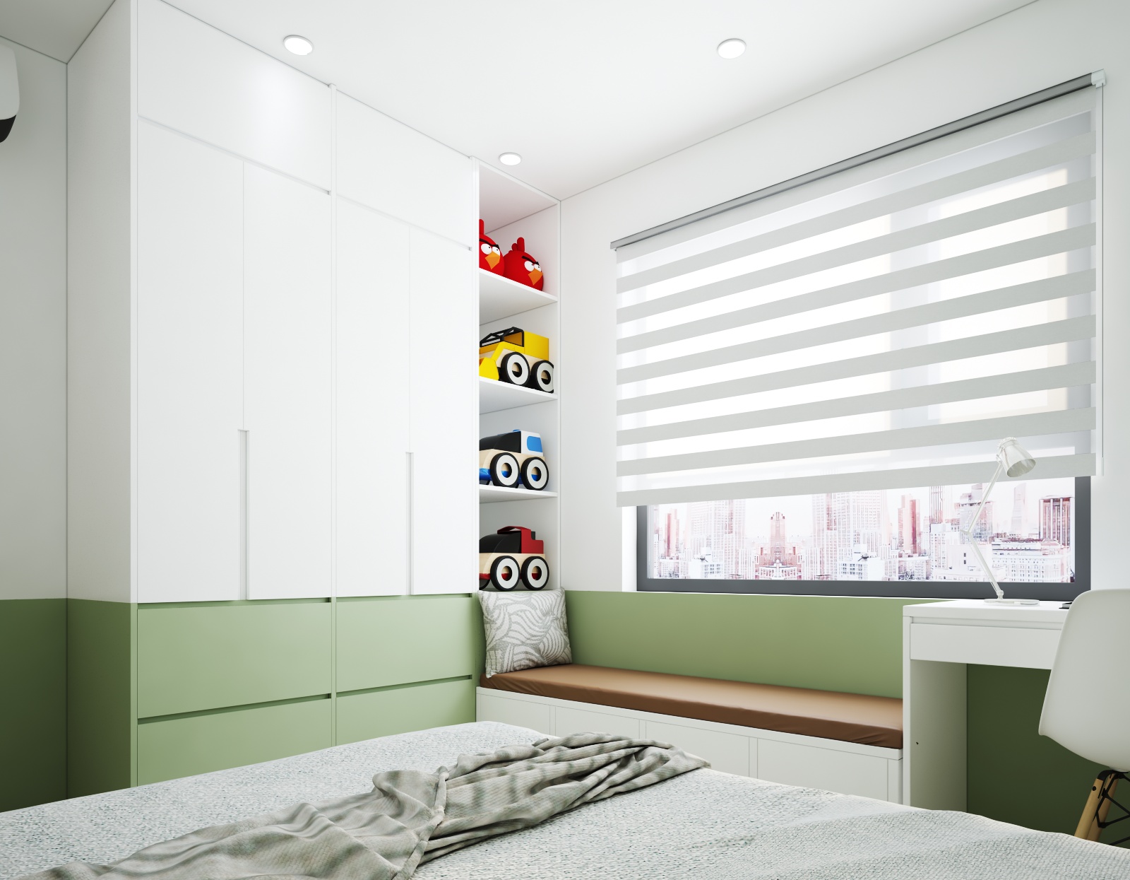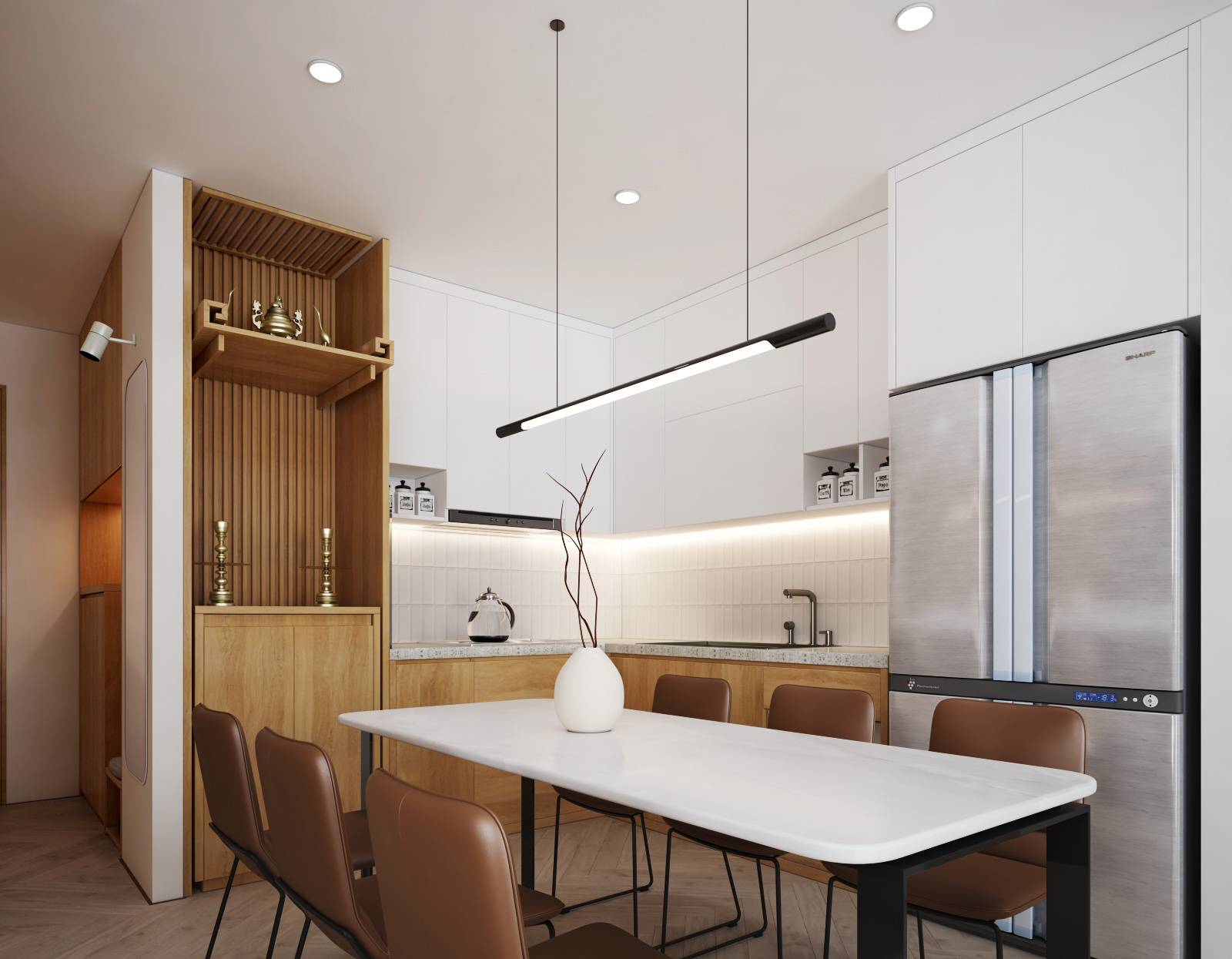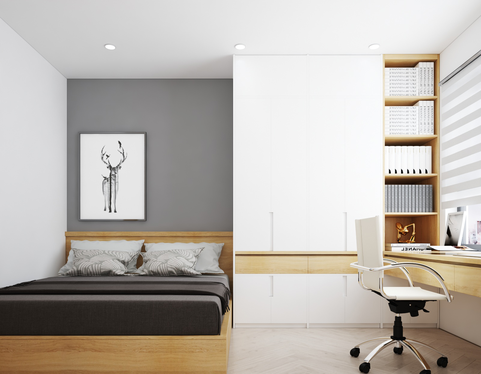 Nội thất căn hộ ba phòng ngủ chủ đầu tư hướng đến màu sắc sáng đi kèm kết hợp giữa màu sắc vân gỗ sáng và màu trắng để không gian được trong sáng nhất có thể. Thiết kế nhấn mạnh theo các mảng miếng để tương quan màu sắc tổng thế được mạnh hơn tạo điểm nhấn không gian.
